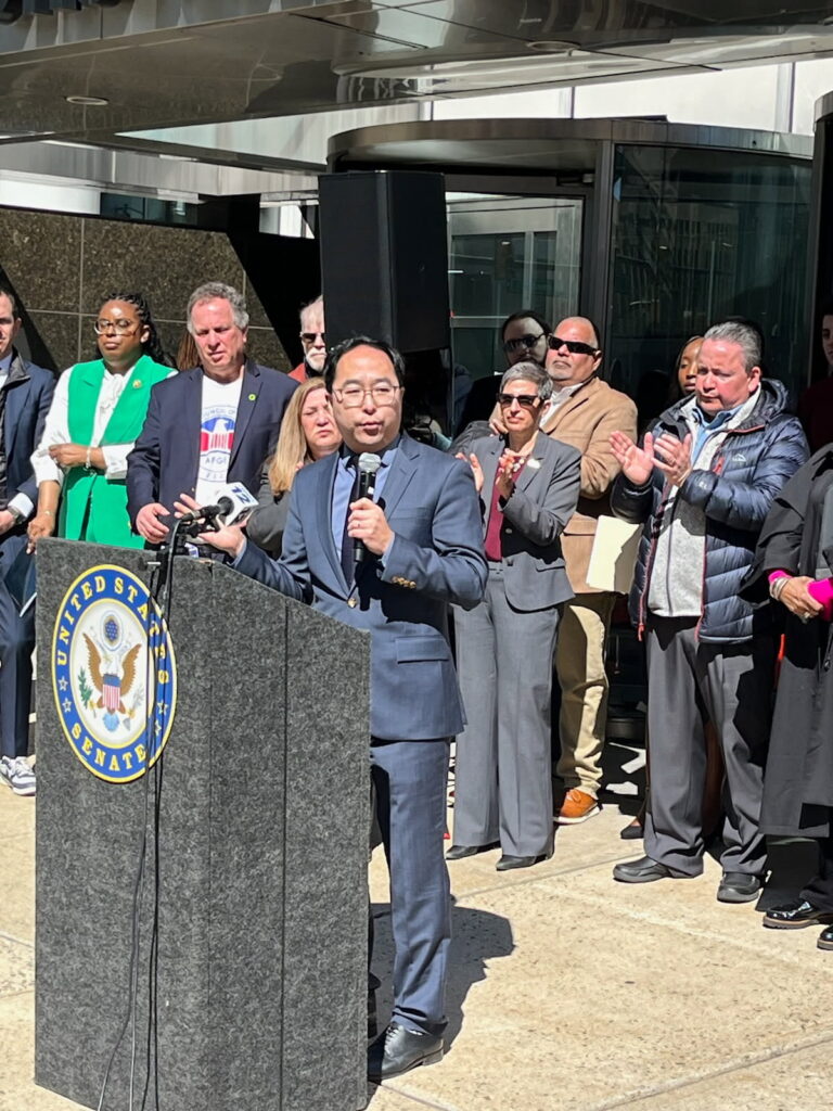 Kim spoke Tuesday at a sidewalk rally to condemn how Trump and Elon Musk are dismantling the federal government. The senator was joined by local Reps. Robert Menendez Jr. and LaMonica McIver.