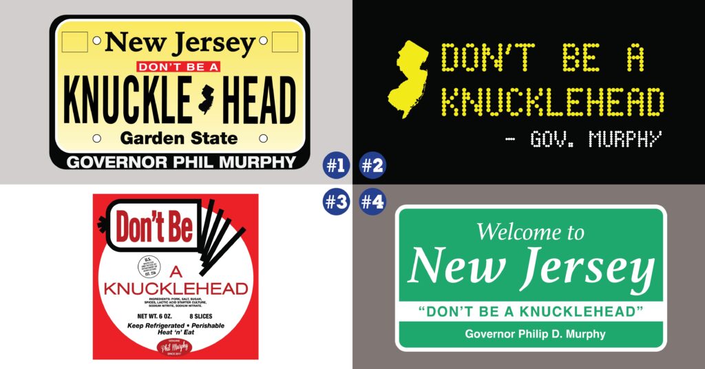 Now, the New Jersey State Democratic Committee is launching a campaign asking residents to choose their favorite “Don’t be a knucklehead” t-shirt design from four choices, each inspired by the Garden State. Once a winner is selected, the party will sell the shirts online and all proceeds will be donated to the New Jersey Pandemic Relief Fund, a 501(c)3 non-profit organization founded by First Lady Tammy Murphy to help residents in need during the pandemic.