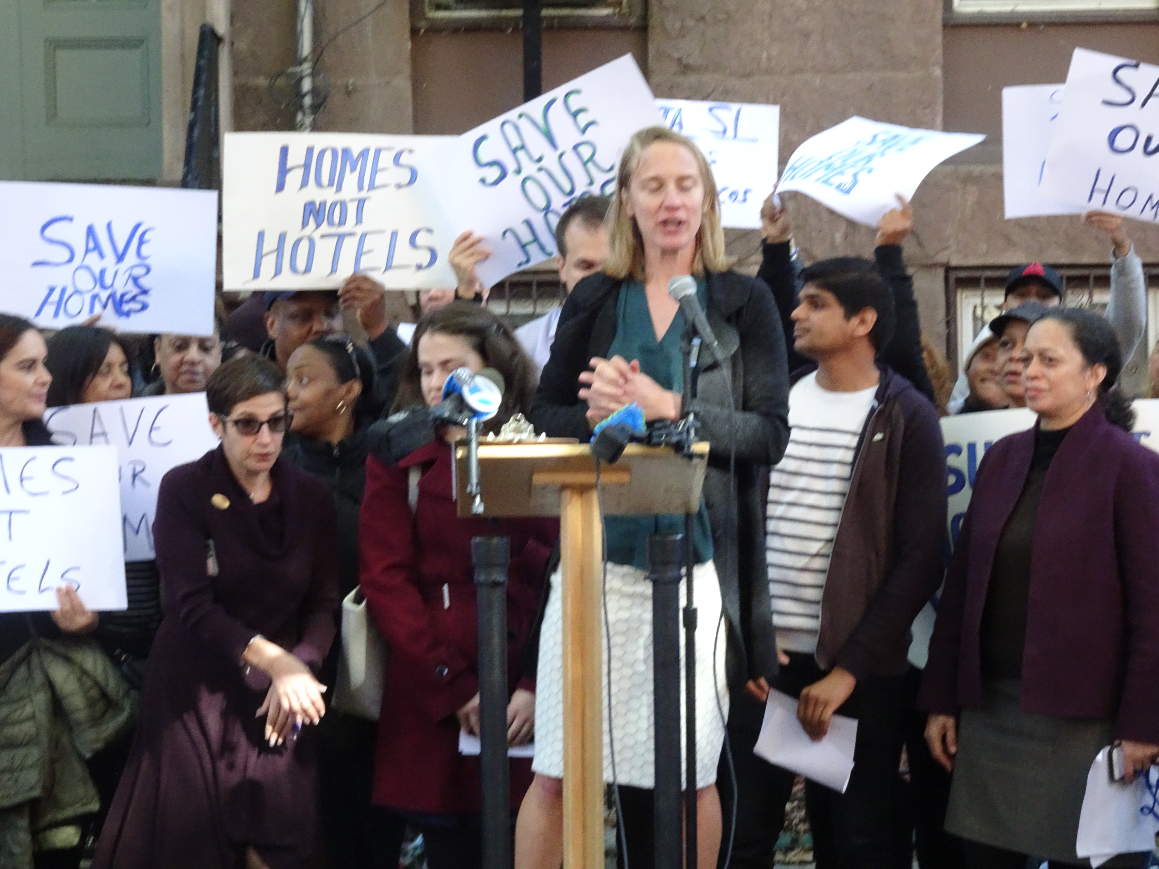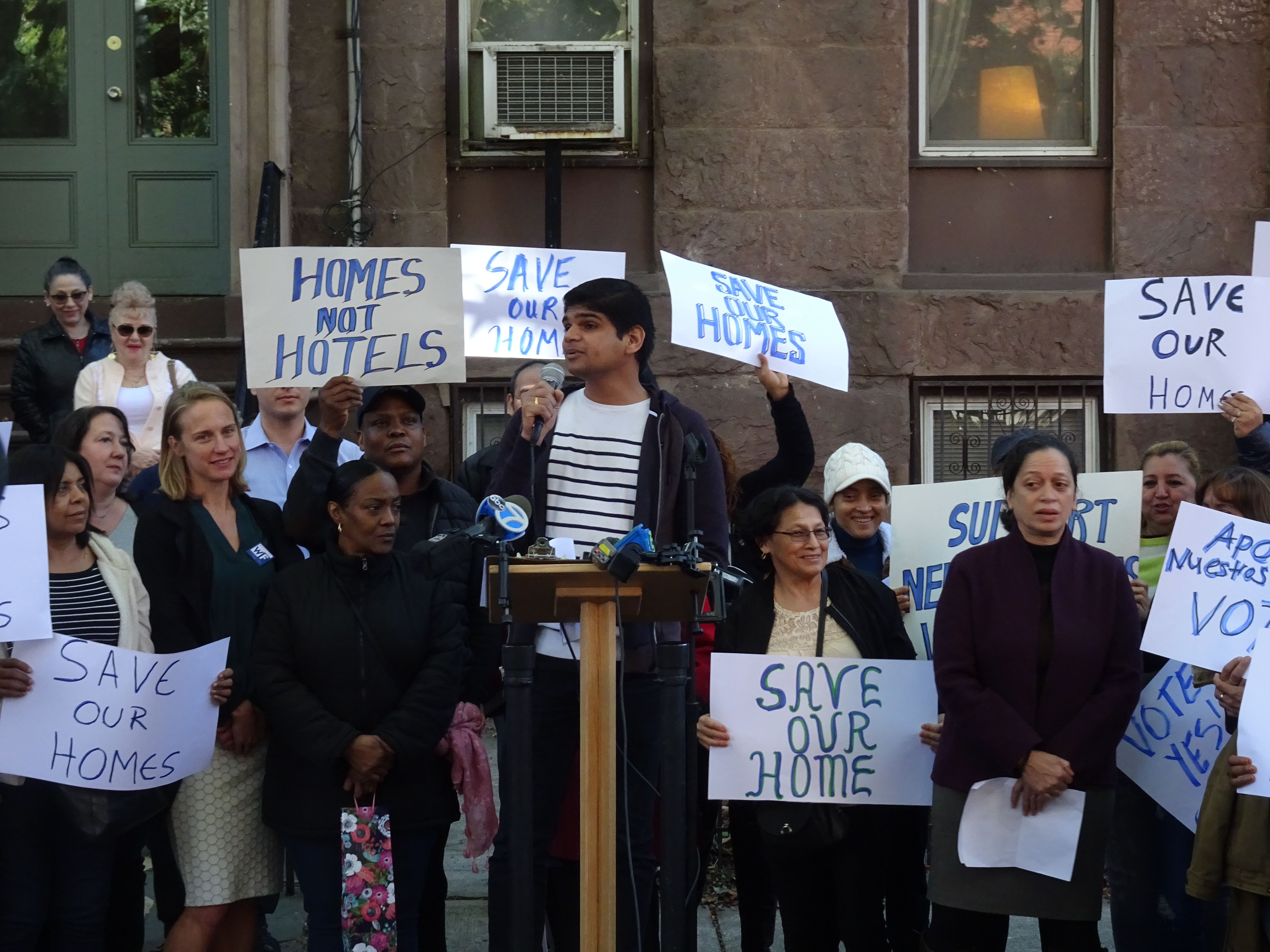 This massive show of elected officials and social justice groups gathered in front of a rent control building owned by a New York real estate agent and rented out short-term on the Airbnb platform.