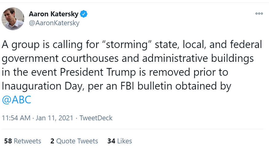 A bombshell report this afternoon from ABC News: "The FBI has 'received information about an identified armed group intending to travel to Washington, DC on 16 January. They have warned that if Congress attempts to remove POTUS via the 25th Amendment a huge uprising will occur,' according to a bulletin obtained by ABC," reports Aaron Katersky.