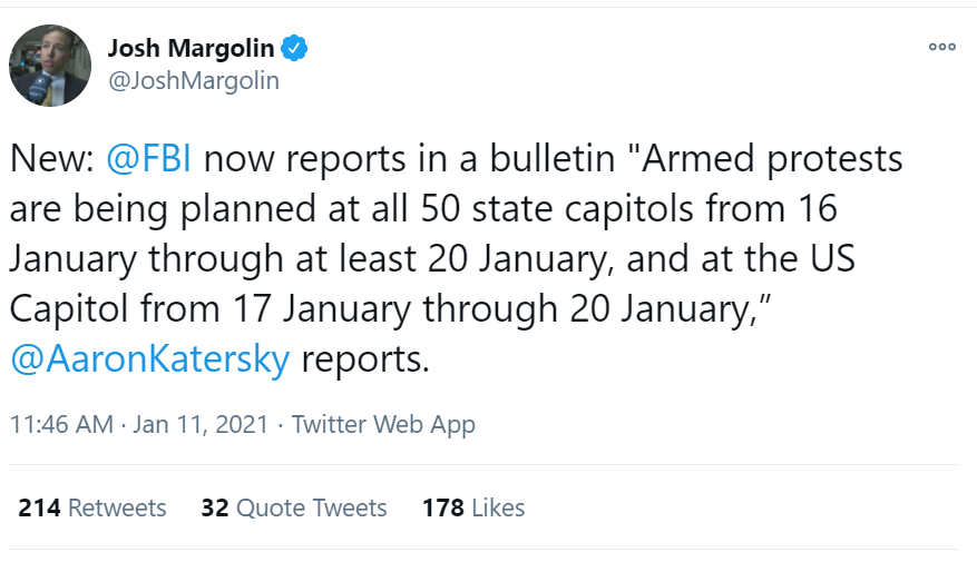 "FBI now reports in a bulletin 'Armed protests are being planned at all 50 state capitols from 16 January through at least 20 January, and at the US Capitol from 17 January through 20 January.''