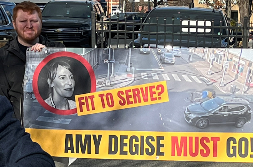 As Neary addressed the press, two men stood nearby with a banner reading "Amy DeGise Must Go."