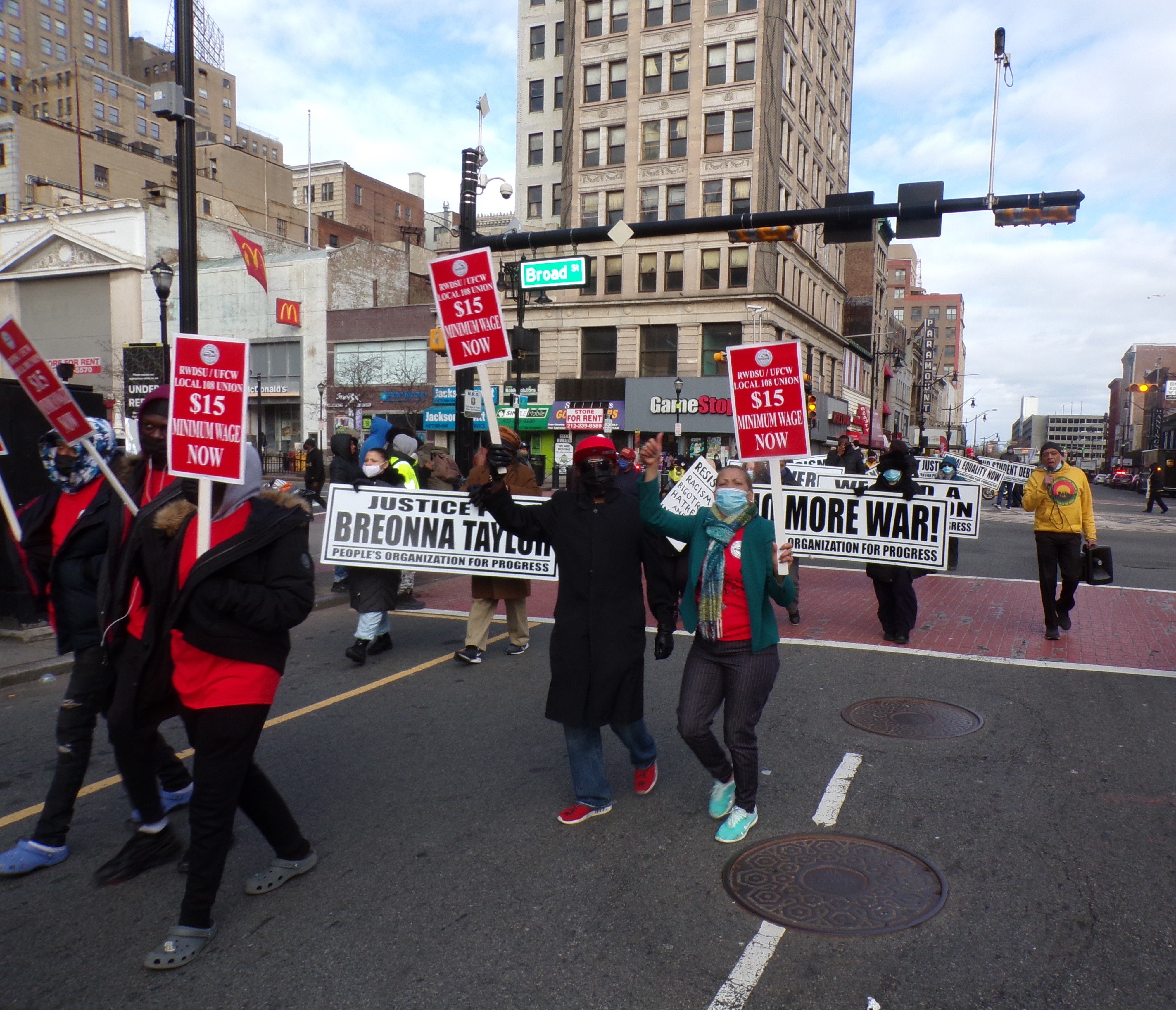 NEWARK - Ahead of the fifty-third anniversary of the assassination of Dr. Martin Luther King, Jr., and day five of the Derek Chauvin murder trial in Minneapolis, activists intent on justice for George Floyd marched down Market Street, additionally motivated by a confluence of deepening justice deprivations, including new cutthroat measures to stymie working class voters in Georgia, and the lack of a federal living wage.