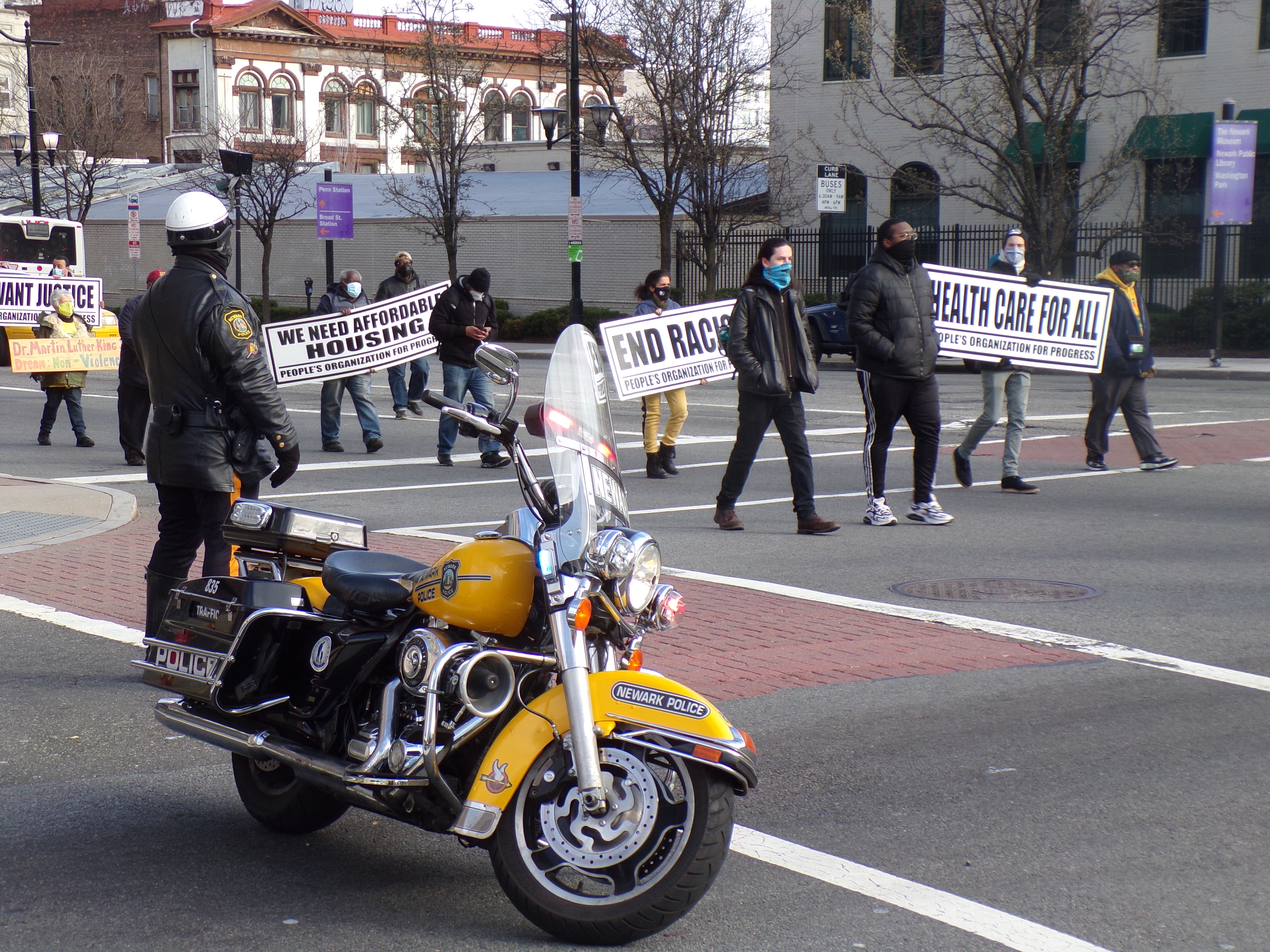 Mounted Newark Motorcycle Police, their vehicles flashing lights and emitting siren blares to clear the way, headed down Market Street to Broad with the activists behind them, Hamm's voice projected over a microphone.