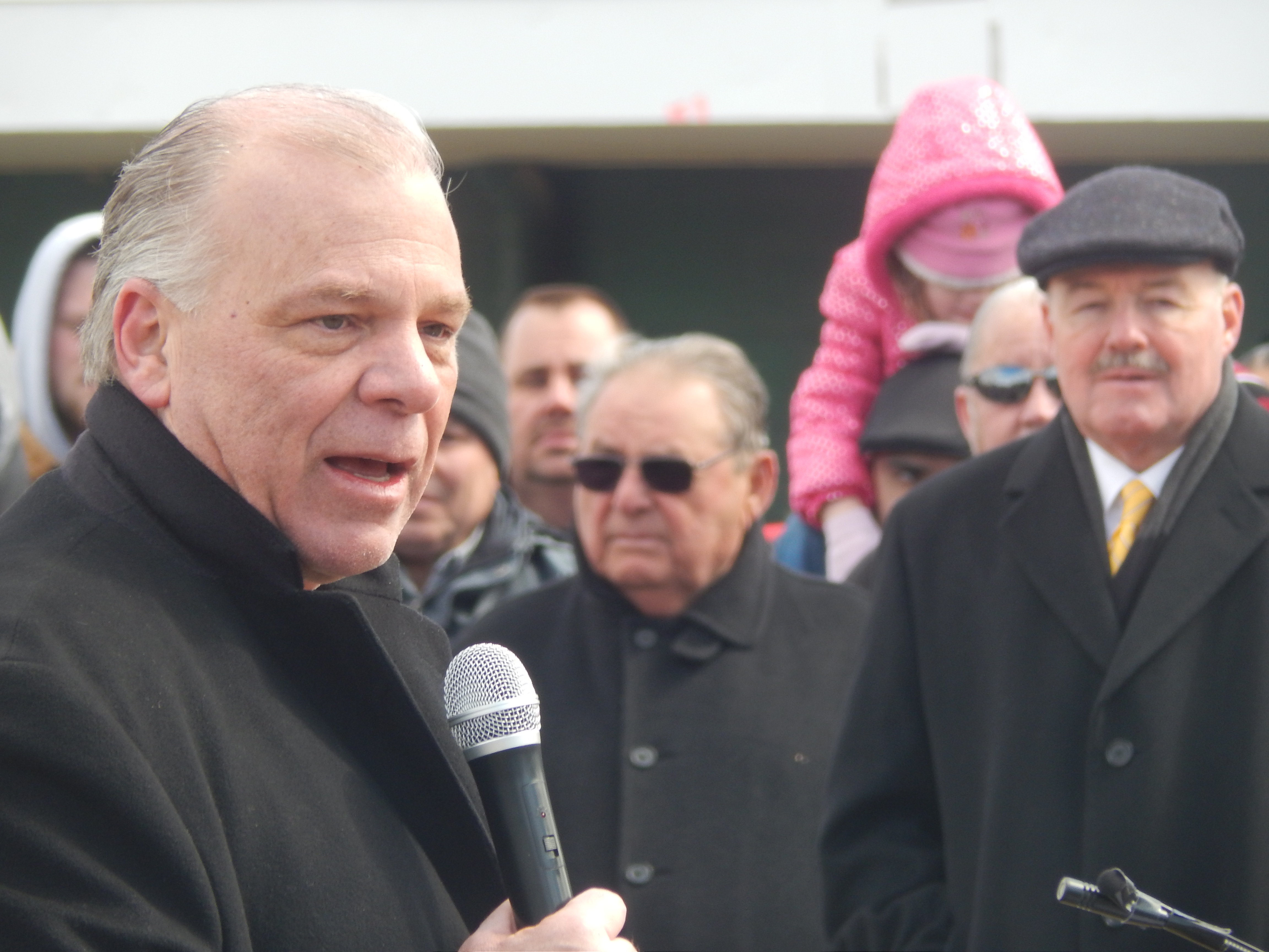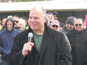 Building Trades President Bill Mullen, Burzichelli and Norcross visibly suffered the cold under layers of cold weather gear in frigid conditions at Sweeney's kickoff, while the senate president wore a terry cloth long coat over a union T-shirt. As Norcross tottered in misery, Sweeney threw open his coat to show his resistance to the cold, and noted the preparation irowworkers have to stare down all weather, unlike trained electricians like Norcross, he cracked.