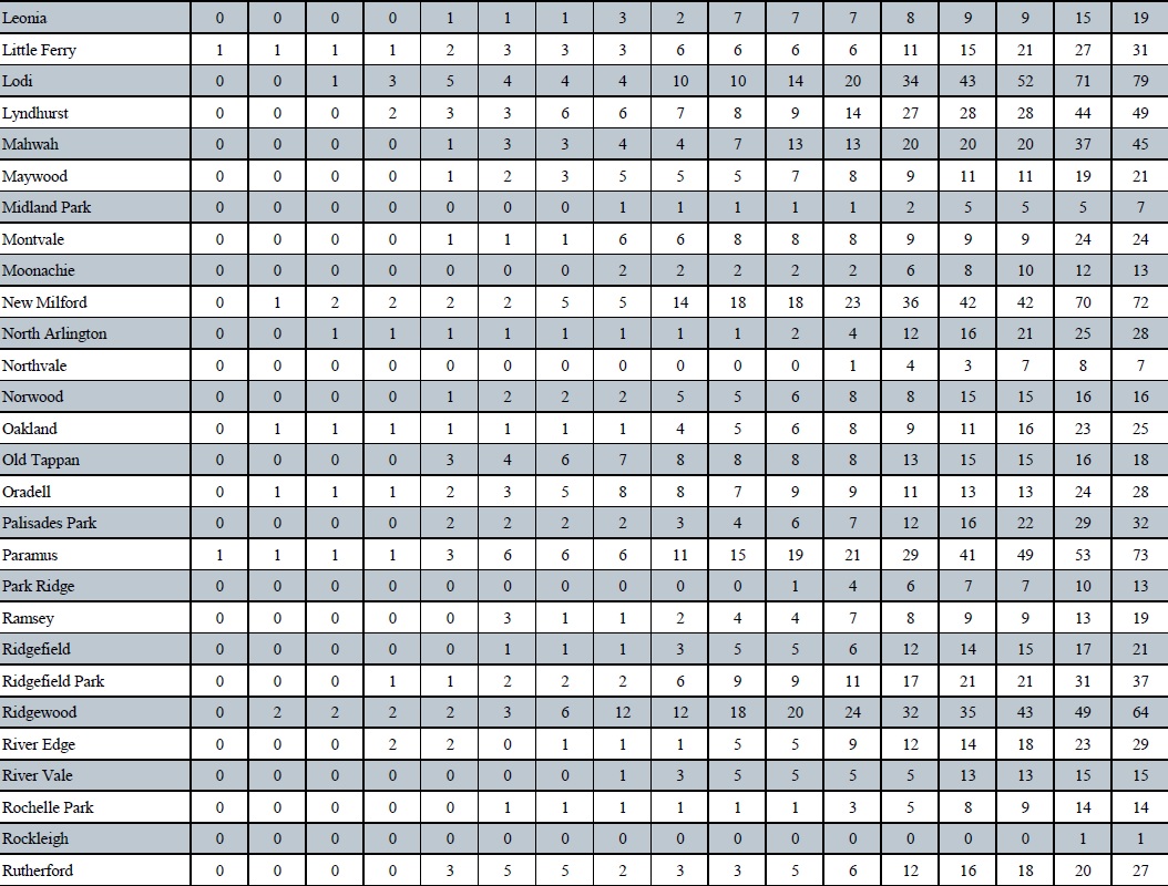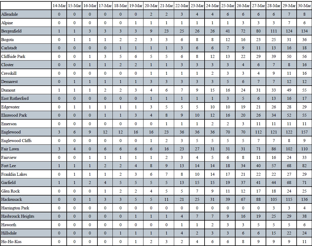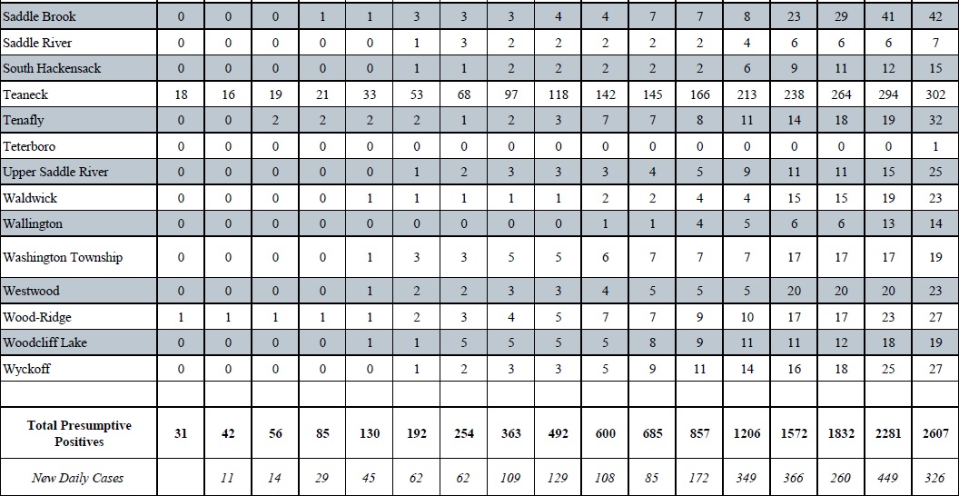 As of 6:30 PM Monday, March 30, 2020, Bergen County has 2,607 total "presumptive positive" cases of COVID-19 identified; impacting 69 municipalities.