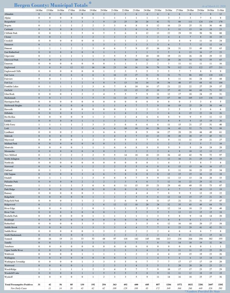 As of Tuesday, March 31, 2020, Bergen County has 3,202 total "presumptive positive" cases of COVID-19 identified, impacting all 70 municipalities.