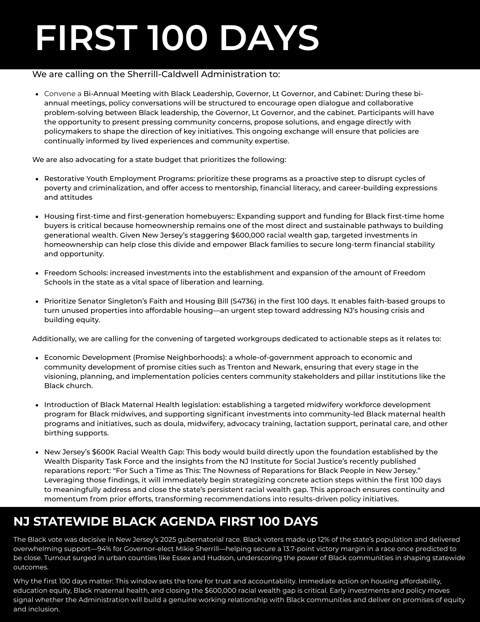 "The great Shirley Chisholm once said, 'If they don't give you a seat at the table, bring a folding chair.' After the turnout for Sherrill by Black people in New Jersey, it is my hope that a folding chair will not be needed because a seat will be prepared and occupied at the table for our voices and concerns to be heard. I wholeheartedly endorse and support the recommendations by the Black Agenda led by my Mayor, Ras J. Baraka, my colleague, Dr. Charles Boyer, and the voice against injustice, Attorney Ryan Haygood."