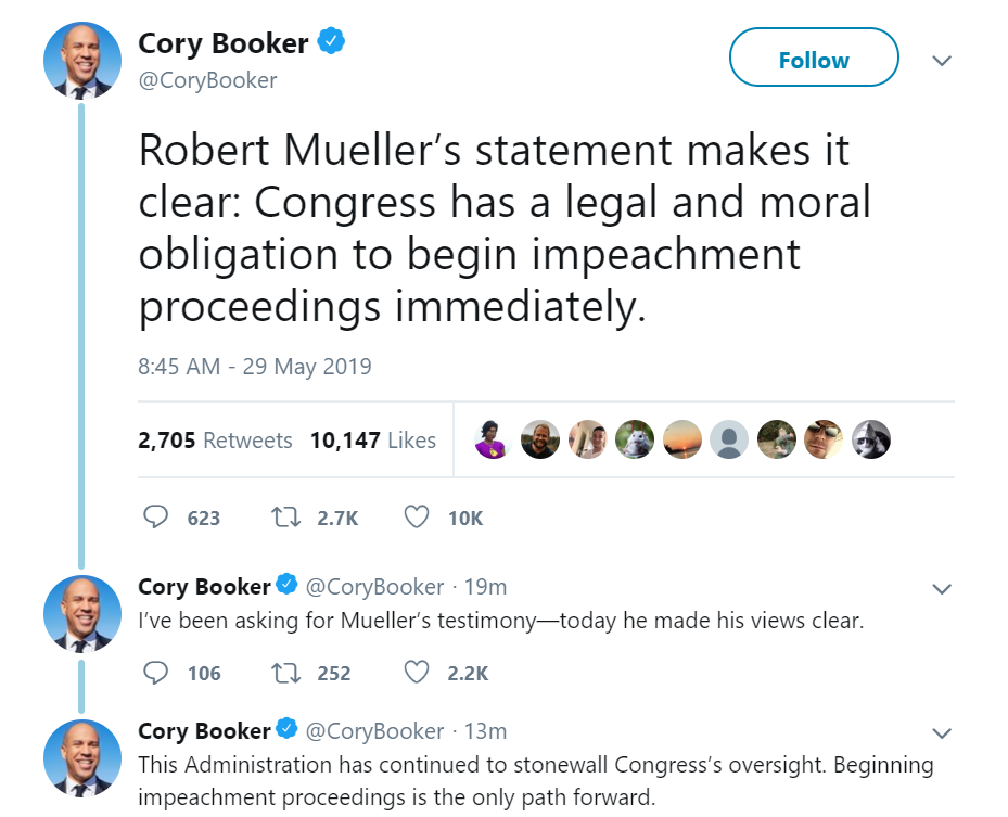 On the heels of a statement by Special Counsel Robert Mueller, U.S. Senator Cory Booker (D-NJ) called for the impeachment of President Donald J. Trump.