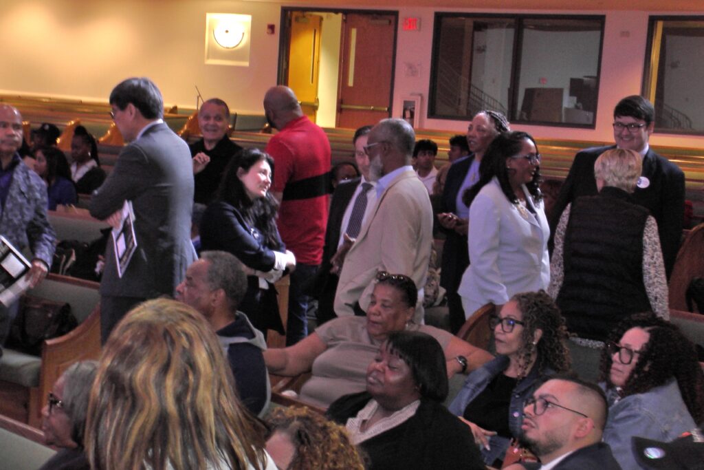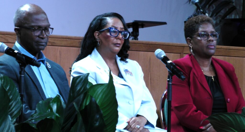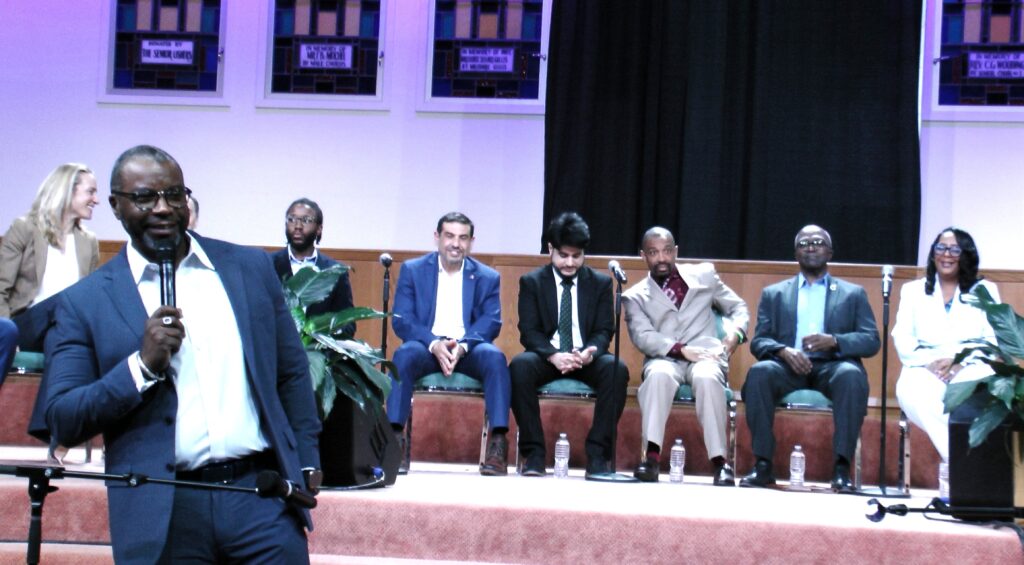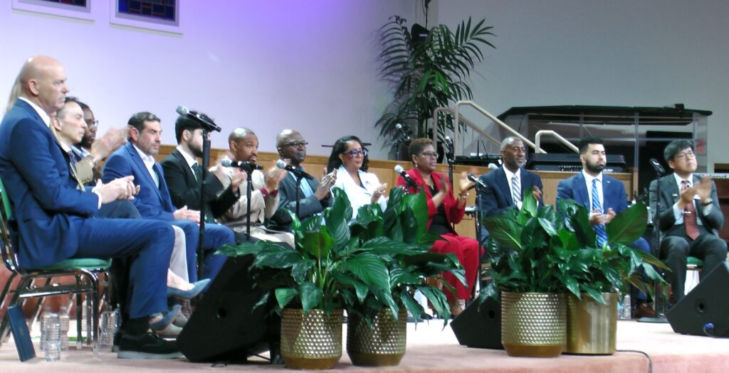 After the Rev. Pastor Charles Boyer introduced debate moderator the Reverend Dr. Bernadette Glover, these candidates looking to succeed retiring U.S. Rep. Bonnie Watson Coleman (D-12) promptly jumped into action. The candidates (above), sitting in alphabetical order from left to right: Matt Adams, Sue Altman, Brad Cohen, Elijah Dixon, Adam Hamawy, Andres Jimenez (Green Party), Kyle Little, Adrian Mapp, Verlina Reynolds-Jackson, Shanel Robinson, Squire Servance, Jay Vaingankar, and Sam Wang.