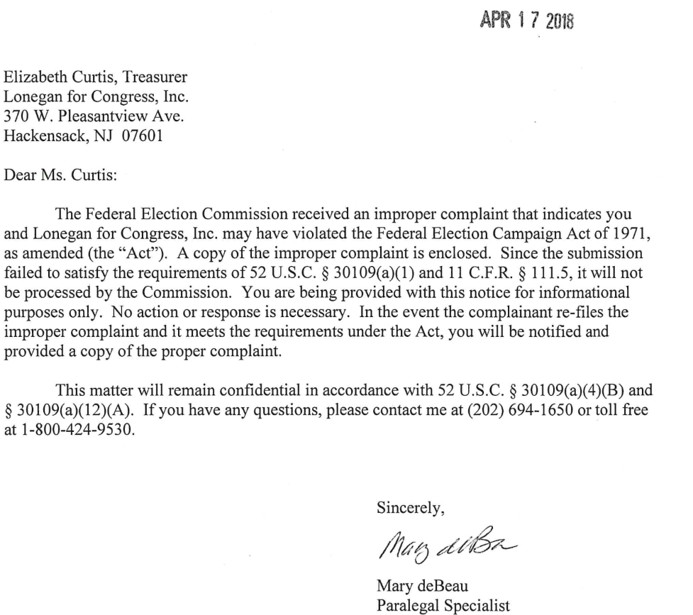Mary deBeau, paralegal specialist at the FEC, notified the Lonegan Campaign on April 17th that the complaint was bogus.