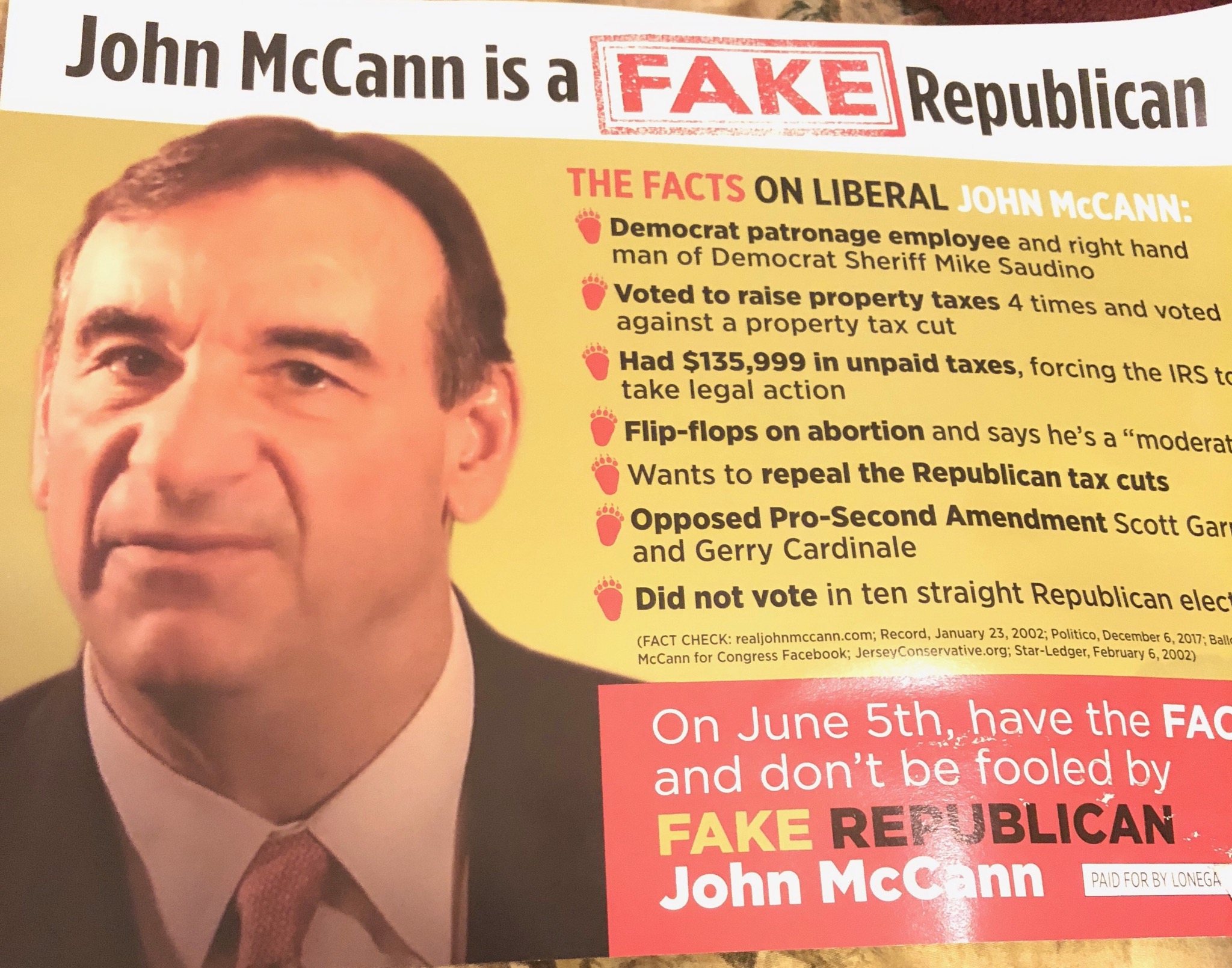 "John McCann claiming to be a Republican is about as real as Bigfoot," the Lonegan mail piece claims.