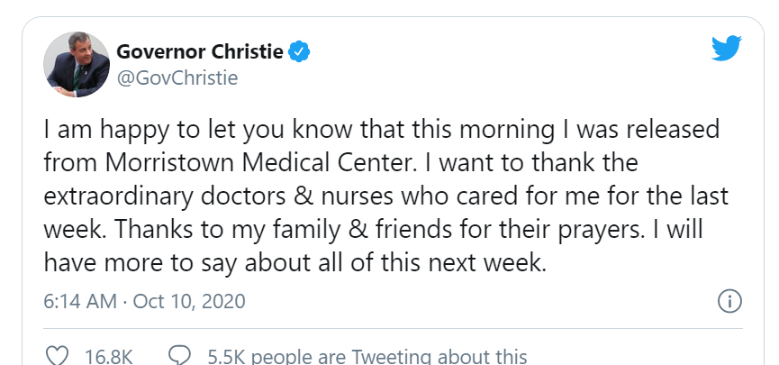 A 58-year old asthmatic who has long struggled with his weight, Christie checked into Morristown Medical Center a week ago after learning that he had tested positive for COVID-19. The former New Jersey Governor took the test after spending several days at the White House helping President Donald J. Trump prepare for his widely panned debate performance with former Vice President Joe Biden, the Democratic nominee for president.