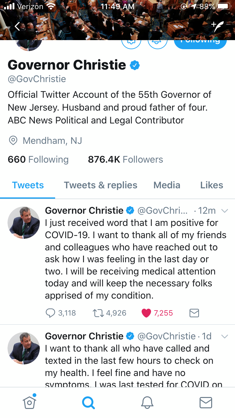 Christie was part of President Trump's debate prep team and noted on ABC News earlier this week that he was in a room with maskless White House staffers and advisers; Trump announced he is positive for the virus on Friday morning.