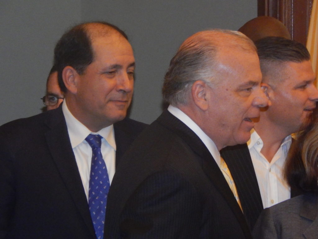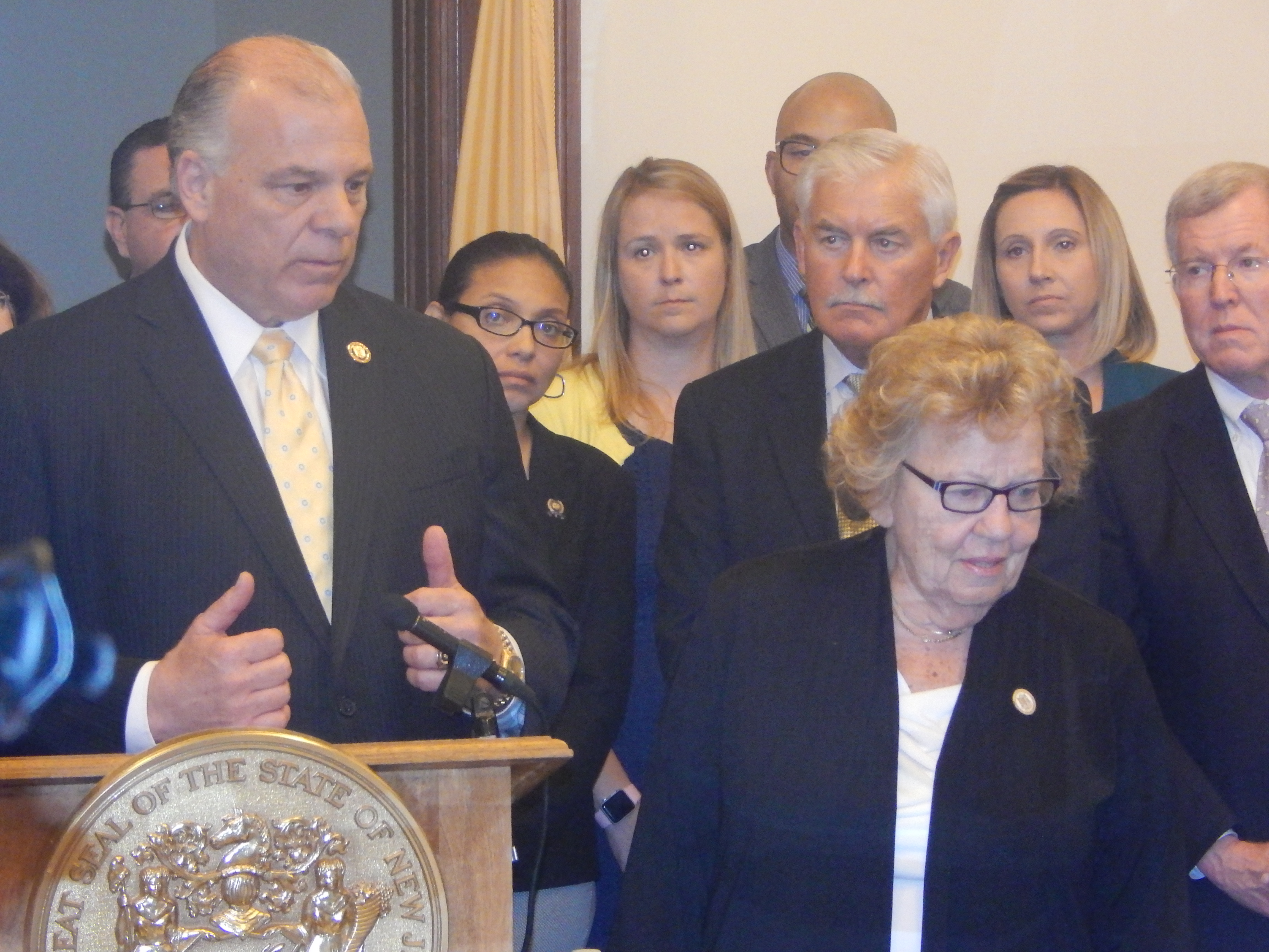 Standing with Senator Joe Vitale, Senator M. Teresa Ruiz, Senator Jim Whelan, Senator Linda Greenstein, Senator Nilsa Cruz Perez, Senator Bob Gordon, Assemblyman Troy Singleton, Assemblyman John Burzichelli, Assemblywoman Pam Lampitt, Assemblyman Gordon Johnson, Assemblywoman Gabriela Mosquera, Assemblyman Arthur Barclay, Assemblywoman Patricia Egan Jones and others, Sweeney came out of the gate with an introduction of Senate Majority Leader Loretta Weinberg (D-37).