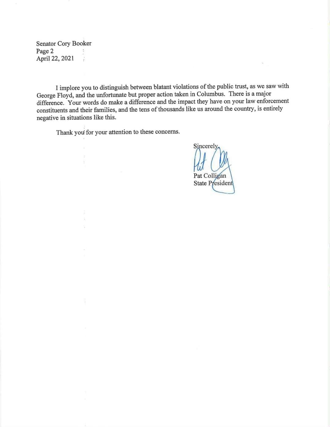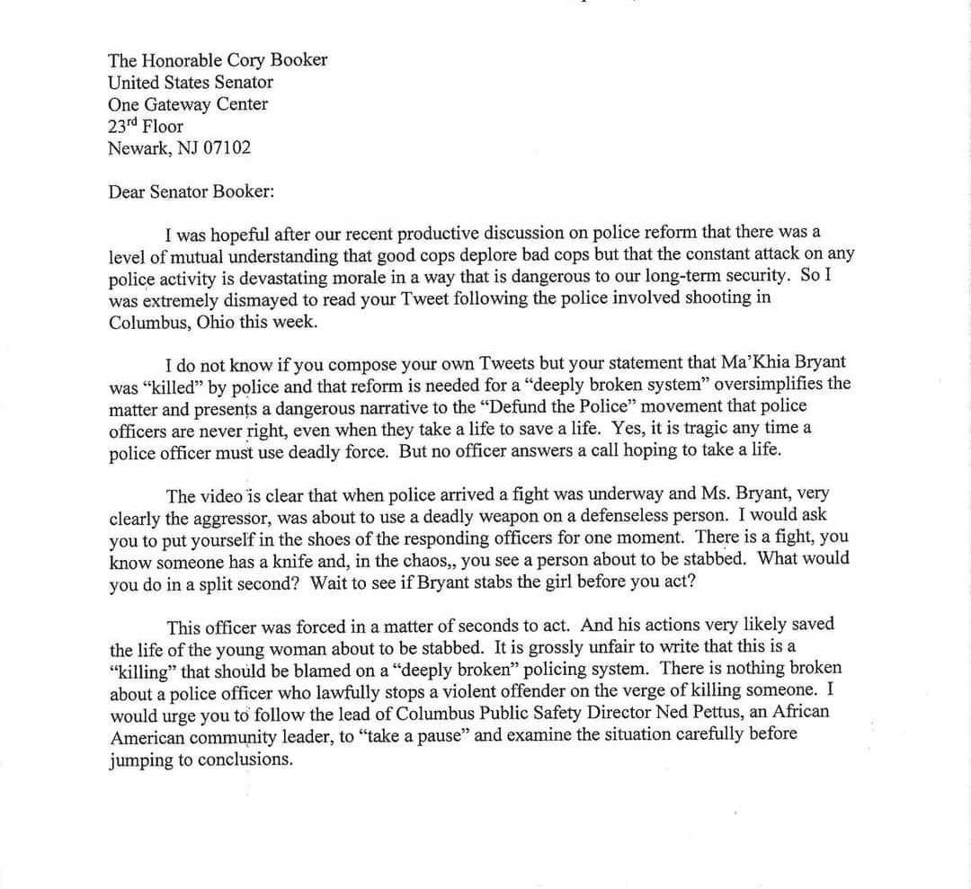 New Jersey State Policeman's Benevolent Association Prez Pat Colligan today sent a letter to U.S. Senator Cory Booker (D-NJ), criticizing him over a Tweet that the junior senator issued in response to the police killing of Ma'Khia Bryant.