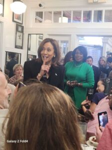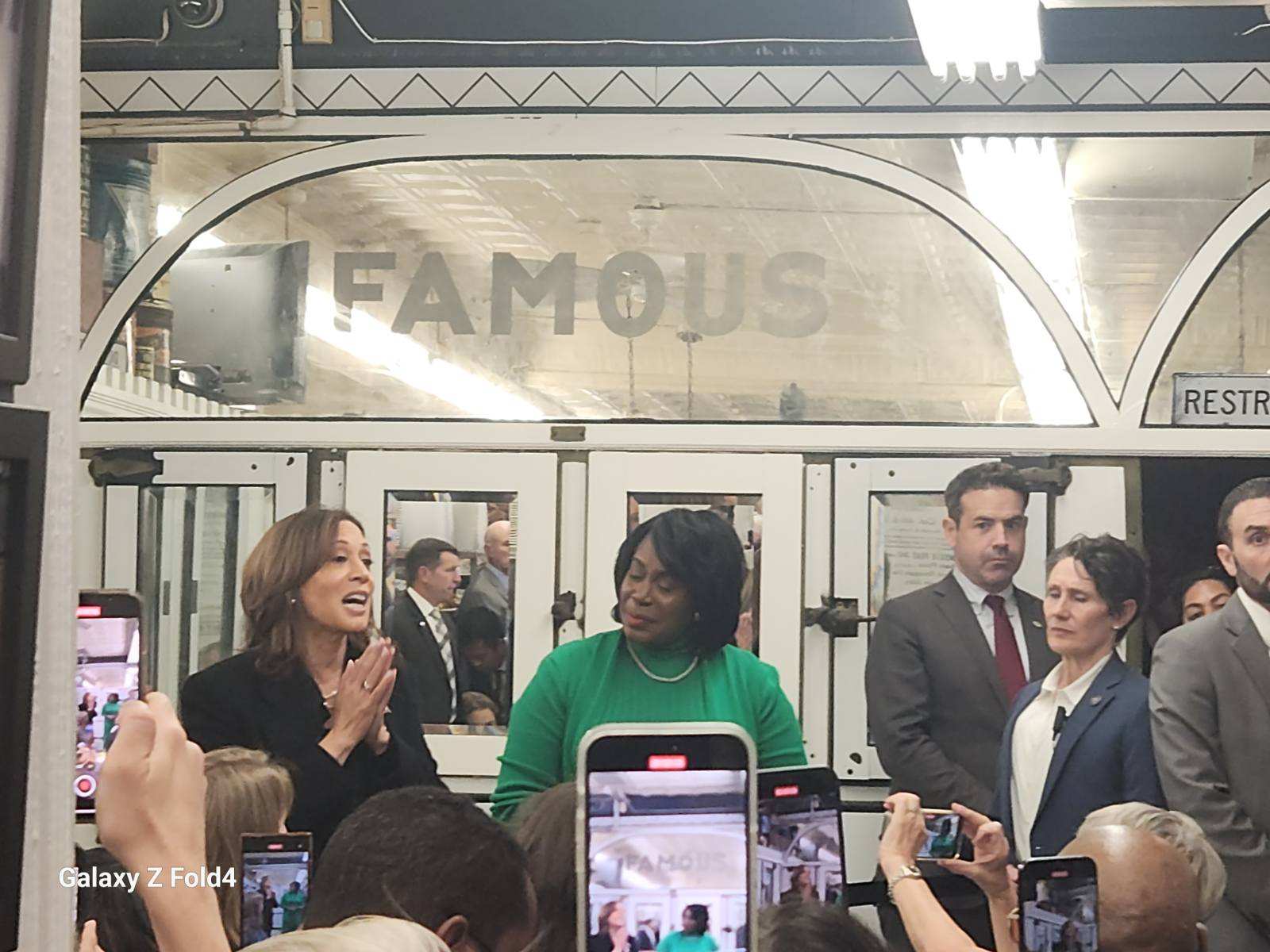 tough-fibered blue-collar pride, organizers convened this afternoon for "Pizza with the Chairman" downtown just prior to Kamala Harris landing to thank them and other campaign volunteers at the Famous Fourth Street Deli with time ticking down to Nov. 5th, Election Day.