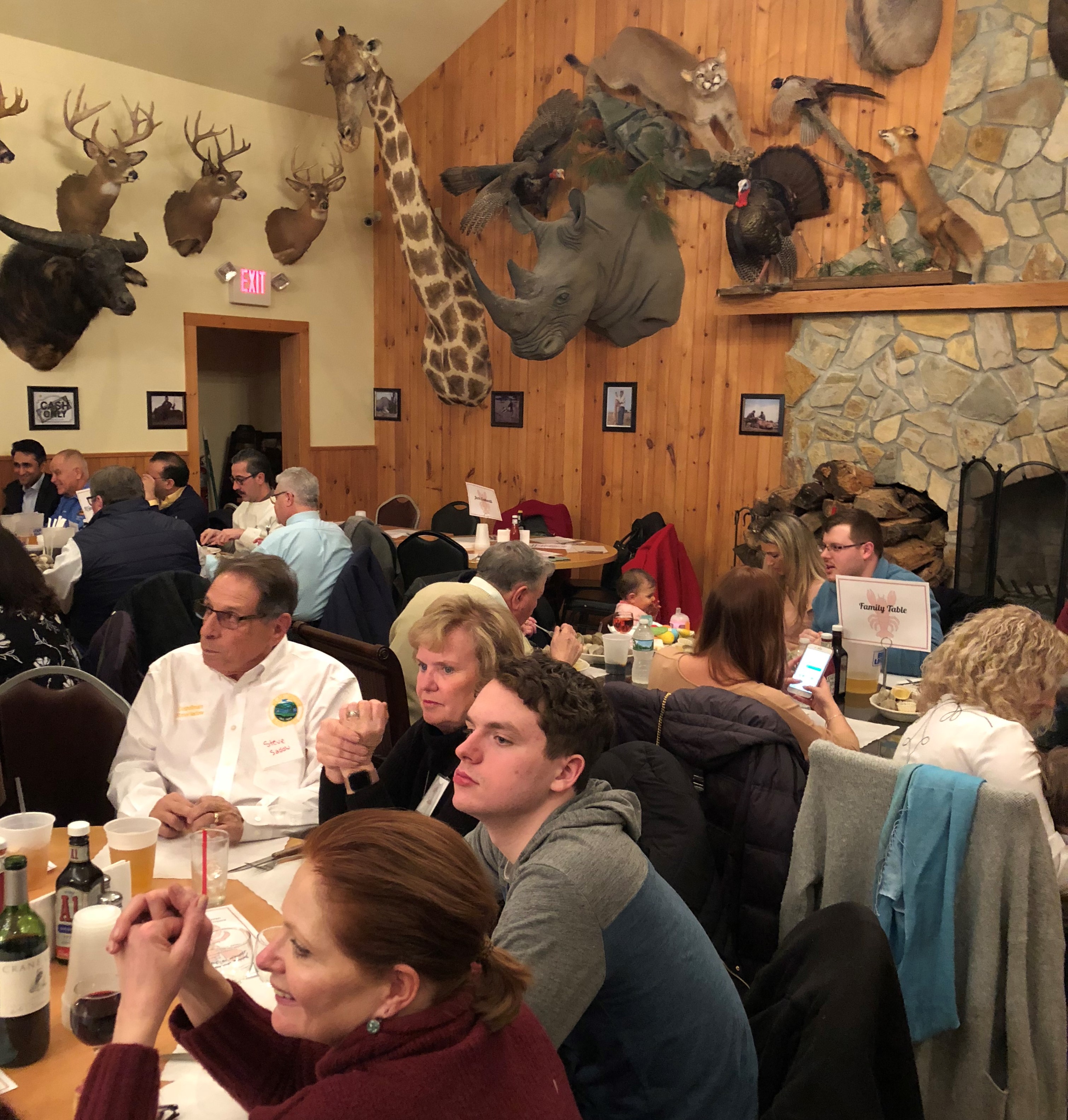 A word is needed to describe the scene. Pub 199 is an iconic structure on Howard Boulevard that features literally dozens of animal heads on the walls and elsewhere. You have many types of deer, but also non-native to New Jersey species like rhinos (the beast, not the political kind) and the aforementioned giraffe. This surely is not the place for a PETA confab. The pub burned down a few years ago, but was rebuilt with the many animal heads reappearing.