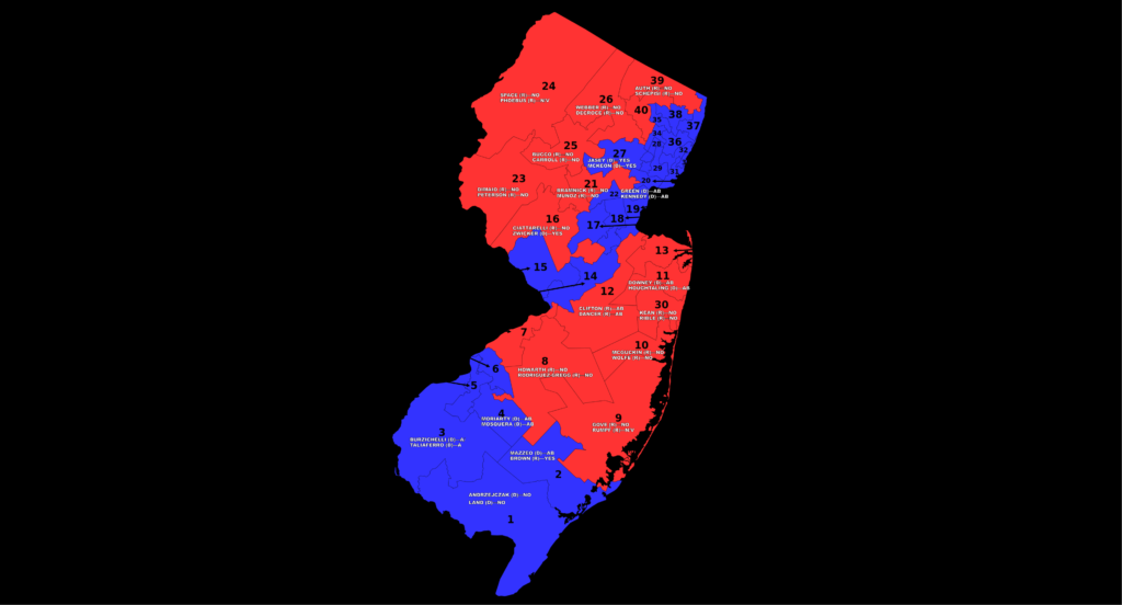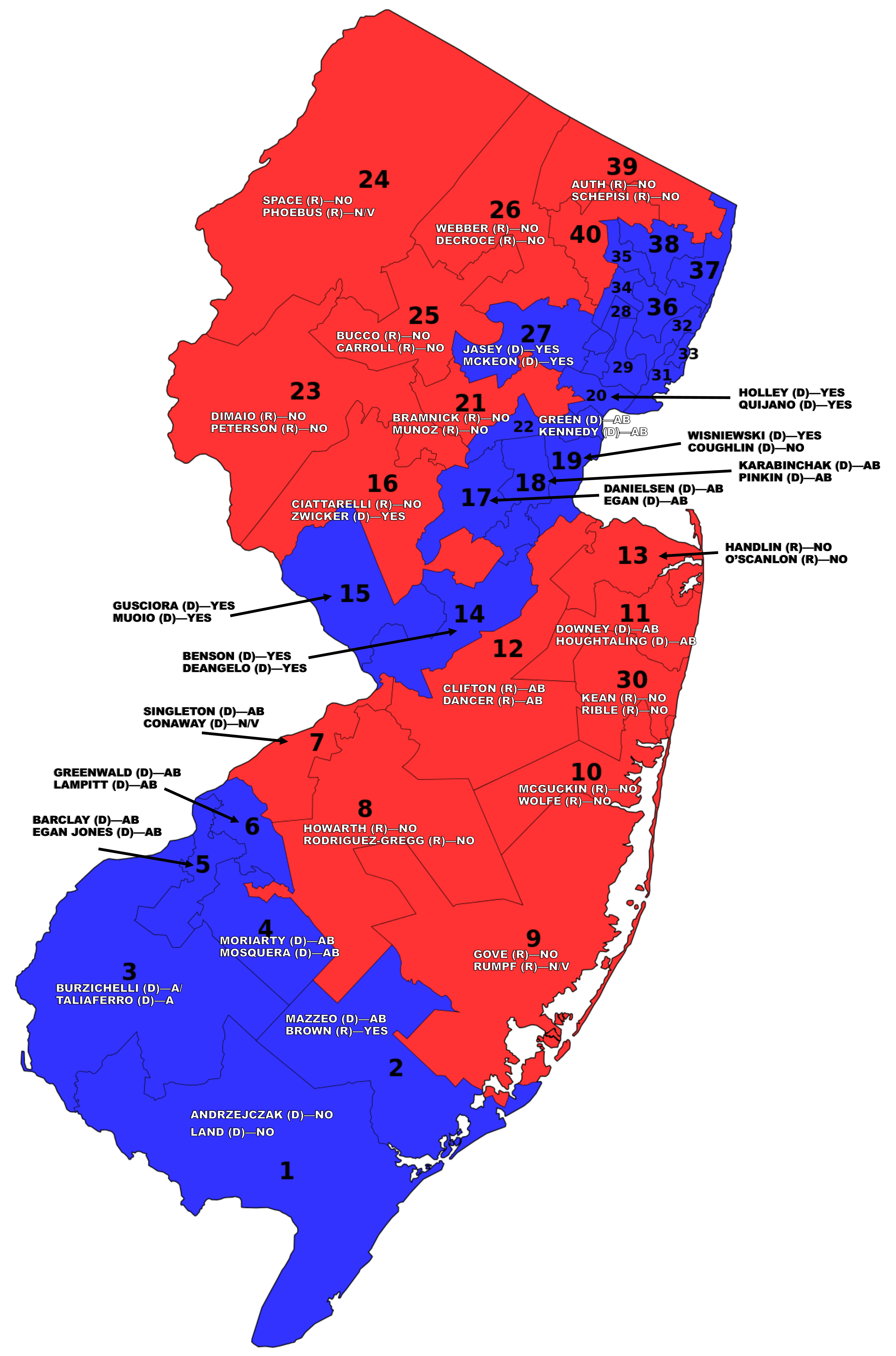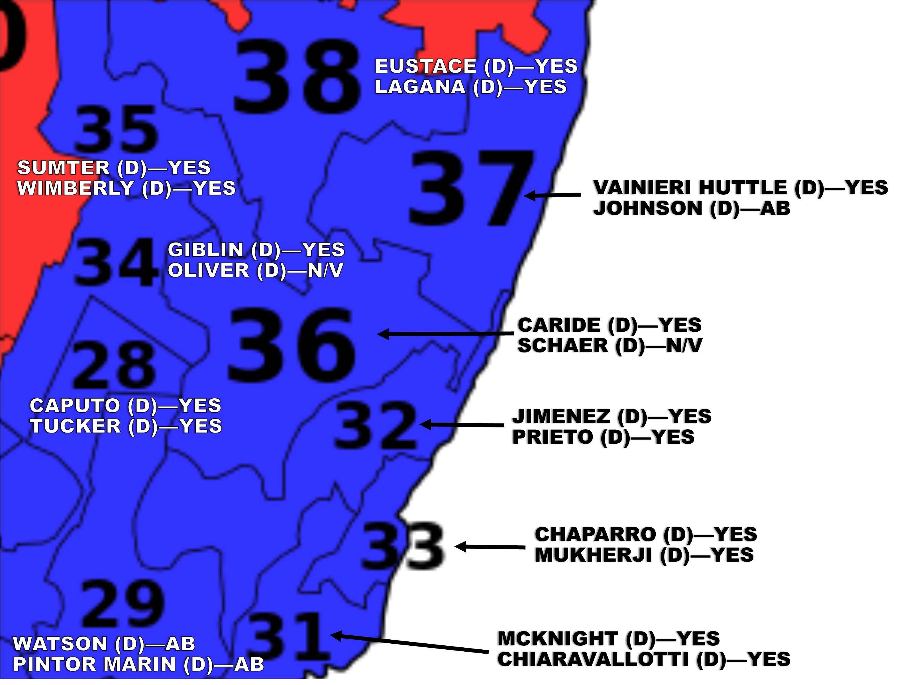 Using Friday's budget vote - and bear in mind the board list is still open with the votes frozen but not yet resolved and open to change (such as Assemblyman Jim Kennedy of LD22 who switched from abstain to 'aye' this afternoon) - this is the geographic depiction district-by-district of which votes are where (N/V is 'not voting' and AB is 'abstain). Bergen and Hudson are below in a close-up depiction.