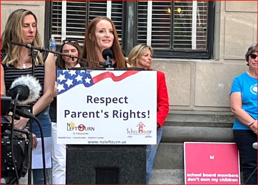 Balestriere and fellow defendant Kristin Cobo both spoke at a rally called to condemn a variety of so-called ills plaguing the public school system. The crowd was not enormous - about 150 people at most - but it was spirited with many waving signs and wearing T-shirts proclaiming parental rights.