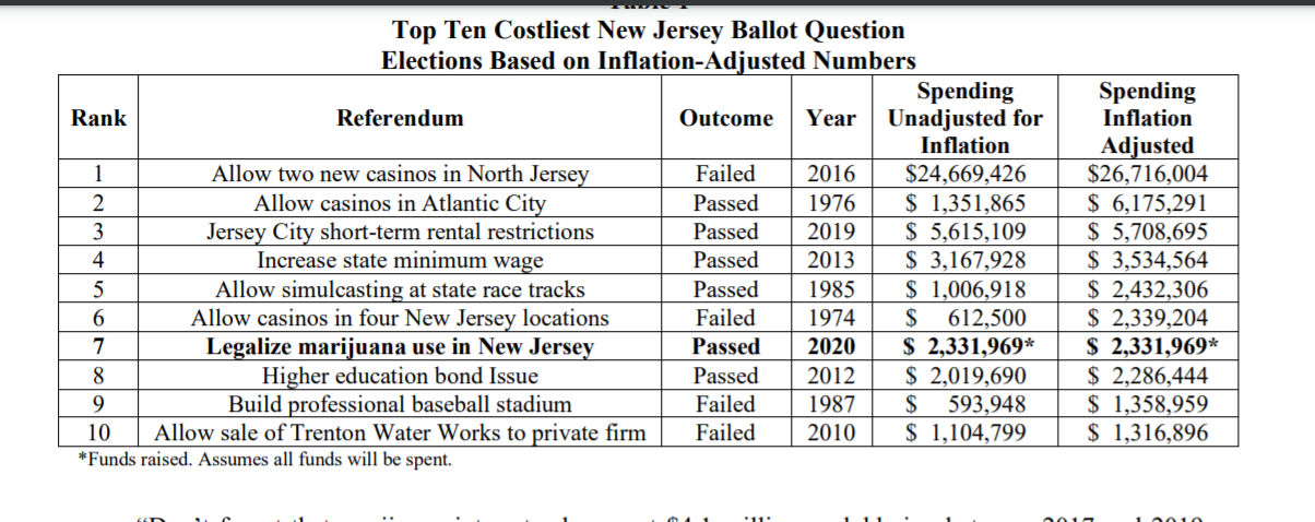most expensive in New Jersey history,” said Jeff Brindle, ELEC’s Executive Director. “While the amount is low compared to some previous New Jersey referendums and most marijuana initiatives in other states, it still is significant.”