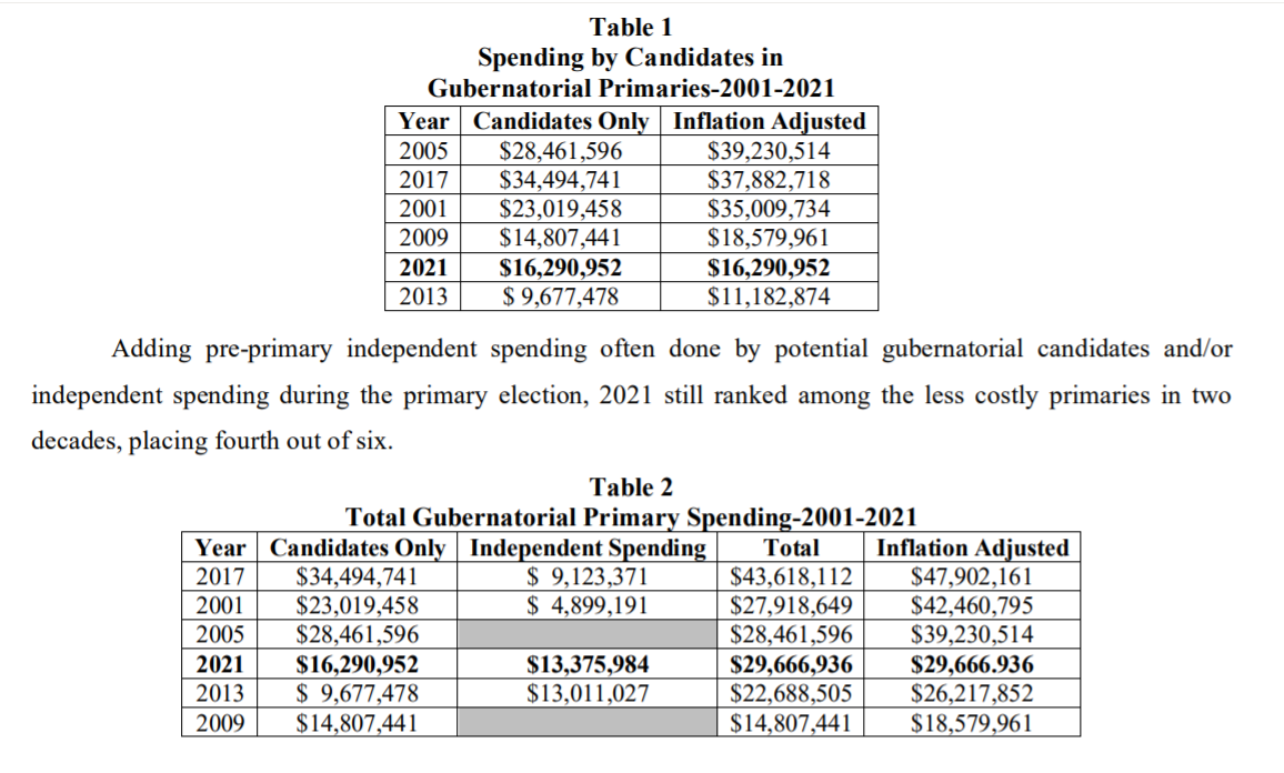 “Measured in today’s dollars, the 2021 primary pales by comparison to most recent gubernatorial