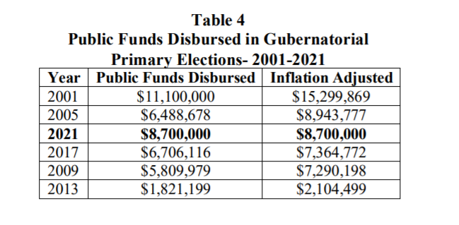 Adjusting for inflation, the $8.7 million total was the third most public funds given out for a gubernatorial primary election in two decades.