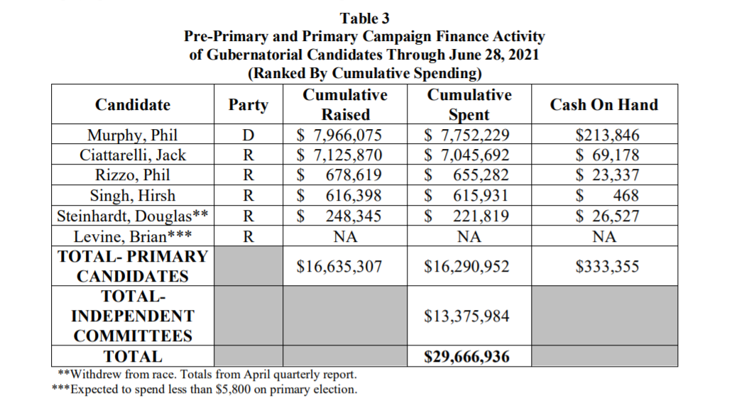 This year, only Murphy and Ciattarelli qualified for public funding. Murphy raised more than enough to