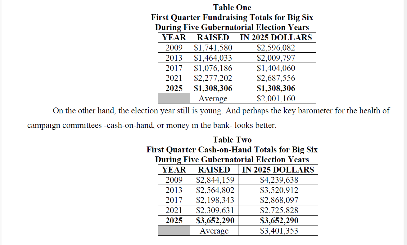 One possible explanation for first quarter fundraising being off is that parties may be laying low until after the June 10, 2025 gubernatorial primary election. With six Democrats and four Republicans vying for their respective nominations, it would make sense that party leaders would try to avoid competing for donor dollars.