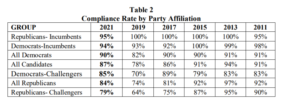 Following a long-standing pattern, incumbents were more conscientious than challengers about submitting their reports.