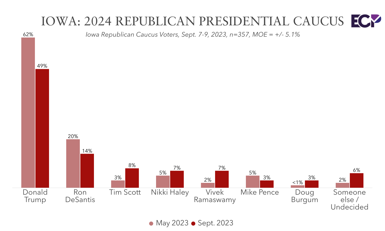 Since the May Emerson Iowa poll, Trump's support has decreased 13 points, from 62% to 49%. DeSantis dropped six points, from 20% to 14%, Scott’s support increased five points, from 3% to 8%, Haley’s support increased two points, from 5% to 7%, and Ramaswamy five points, from 2% to 7%.