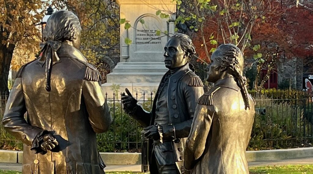 Three life-size statues of Washington, Hamilton and Lafayette stand on the Green, depicting a meeting among the trio during the Revolutionary War.