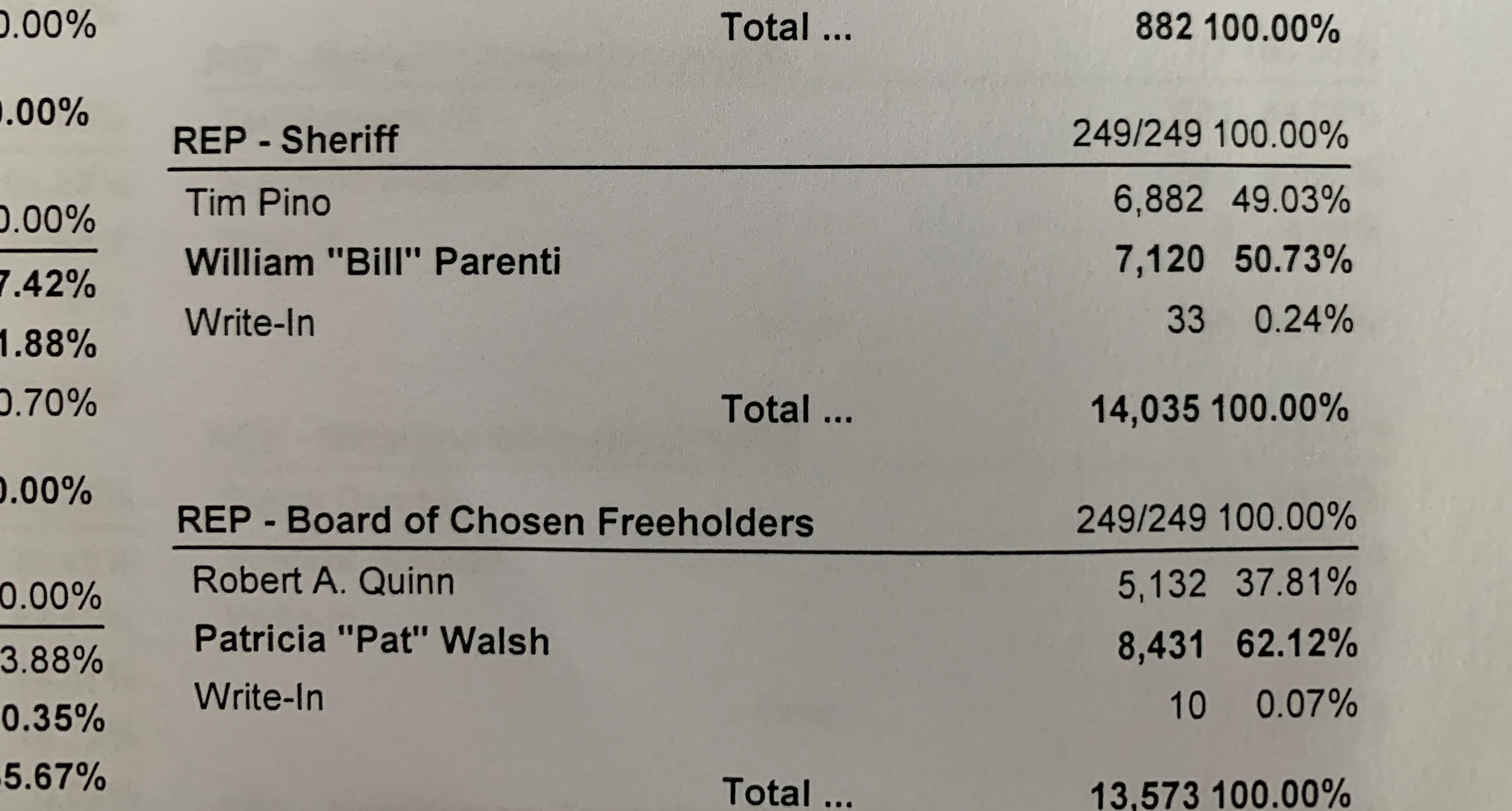 The final tally after provisionals and VBMs was 7,120 votes for Parenti and 6,882 for Pino.
