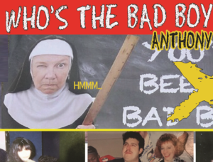 The piece shows him as a young cop in uniform, romping around with scantily clad women. "Anthony Campos, You've been a bad boy," the piece says, alongside a steely-eyed nun with a ruler, apparently looking to mete out punishment.