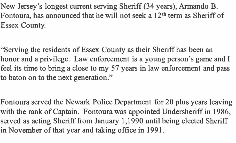 Fontoura Won't Pursue Reelection By Max Pizarro | March 18, 2024, 12:18 pm | in News Essex County Sheriff Armando Fontoura plans not to seek reelection. Article Tags: Armando Fontoura Essex County Sheriff Click here for the full Insider Index