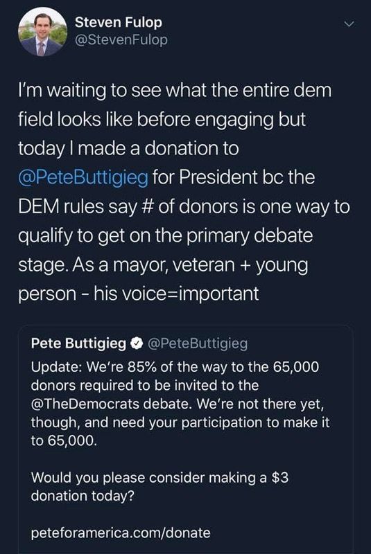 Fulop Makes a Donation to Prez Candidate Buttigieg By Insider NJ | March 14, 2019, 9:54 am | in City Confidential Jersey City Mayor Steve Fulop tweeted last night that he has made a donation to the presidential campaign of South Bend Indiana Mayor Peter Buttigieg. Article Tags: Jersey City Pete Buttigieg Steve Fulop Click here for the full Insider Index