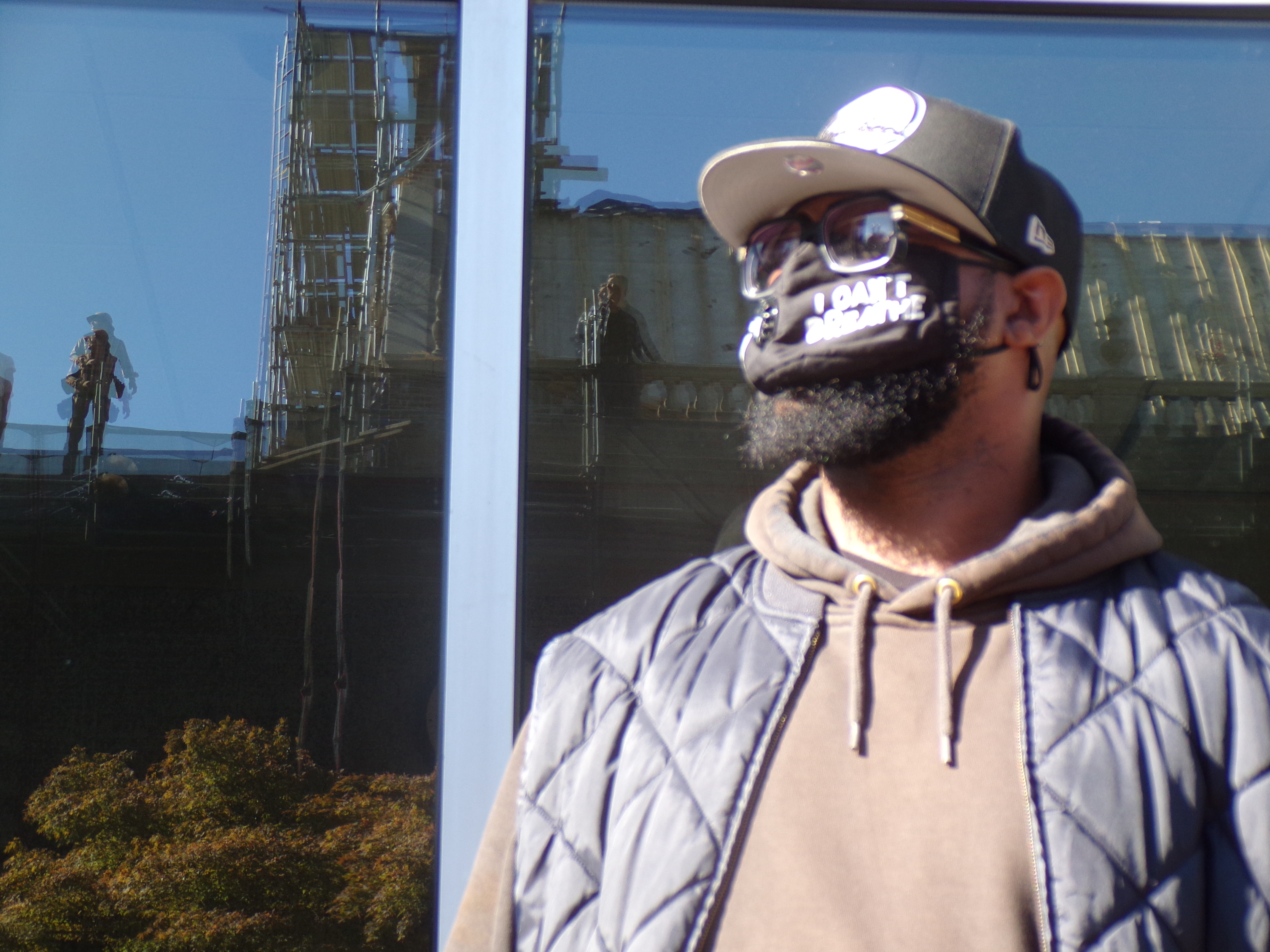 In the crowd, behind mask with a fist on it and the words "I can't breathe," stood Terrence Floyd.