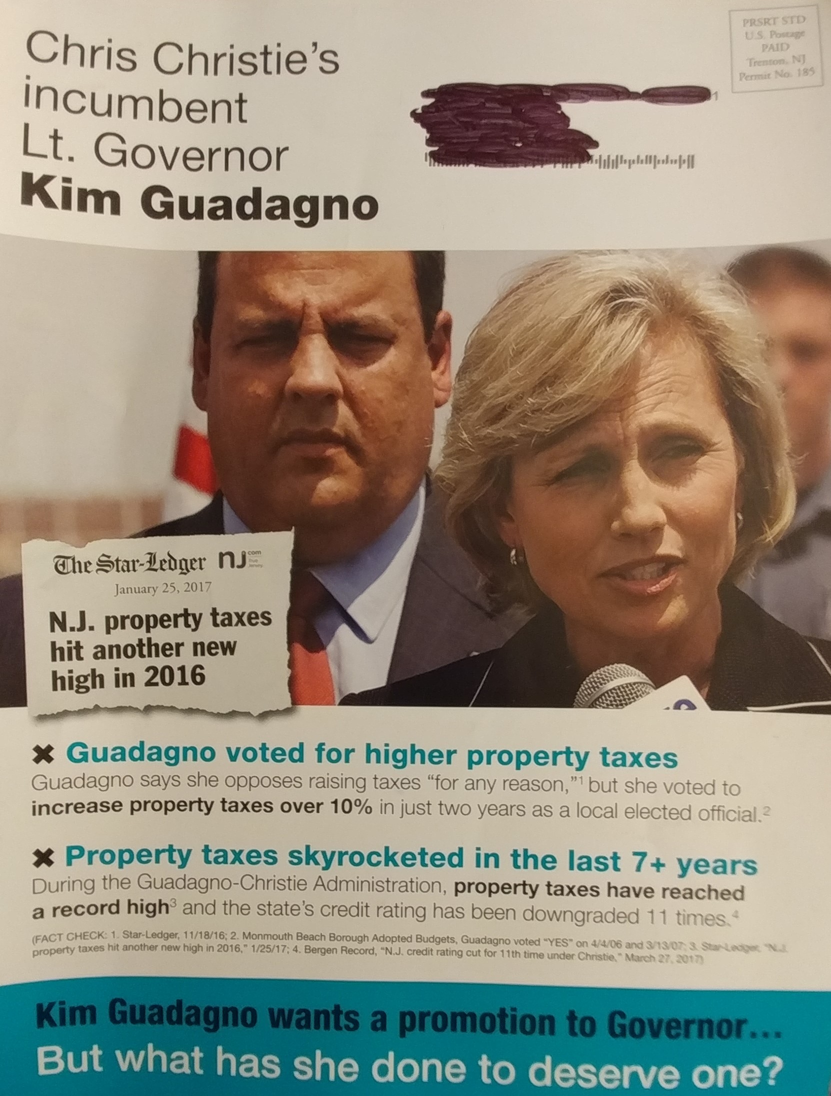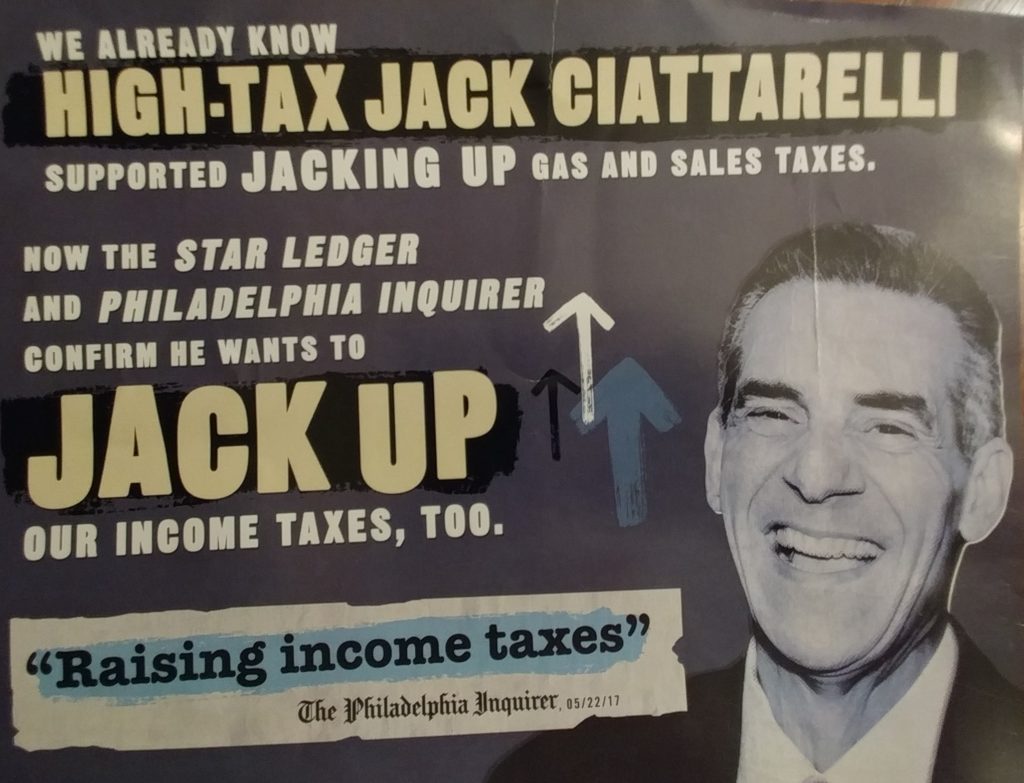 Guadagno toyed with "High Tax Jack" in earlier mail pieces, then drew a bead on "Jack it Up," which reinforces the jingle in her television commercials.