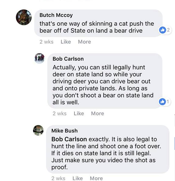 Facebook threads shows bear hunt activists discussing organized drives of black bears on state lands in order to shoot the animals “on the line” or on adjacent properties. The hunters also discuss “leav[ing] tracts of state land alone for first couple of days to allow bears to hide. Then push it off” (sic).
