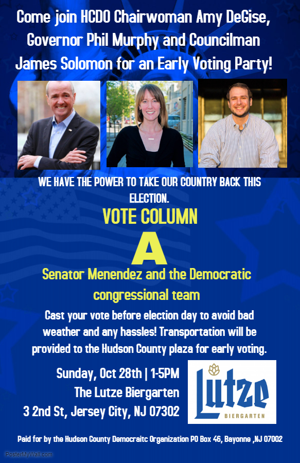 1:00 p.m.: Jersey City Early Voting Party with Jersey City Councilman James Solomon & Hudson County Democratic Organization Chairwoman Amy DeGise - Harborside Atrium, 210 Hudson Street, Jersey City (Hudson County)