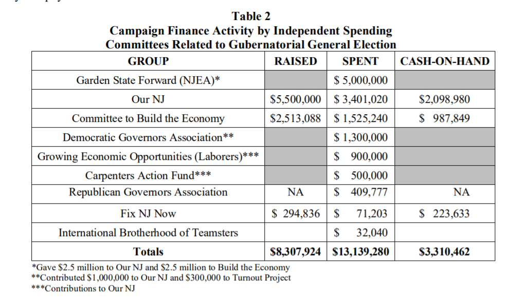 The biggest contributor to Our NJ is Garden State Forward, which has given $2.5 million. The group is a