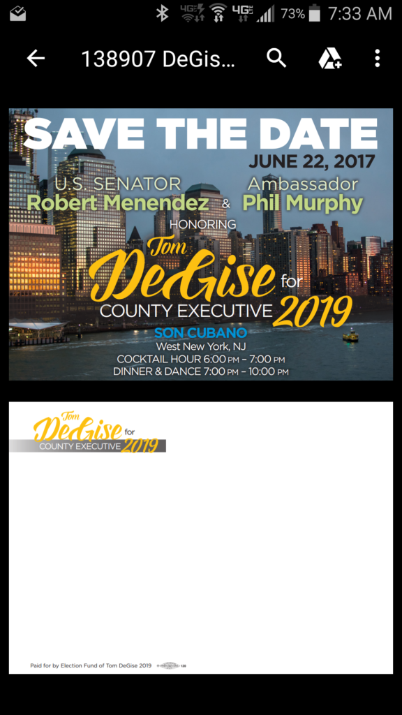 Invites went out this past week to a U.S. Senator Bob Menendez and Ambassador Phil Murphy fundraiser for DeGise, who's up for reelection in 2019.