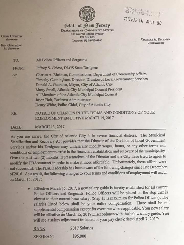 South Jersey radio show host Harry Hurley is reporting that Atlantic City Chief Executive Officer Jeff Chiesa's action plan for the city includes substantial salary and fringe benefits reductions for Atlantic City Police Captains, Lieutenants Sergeants and Officers.