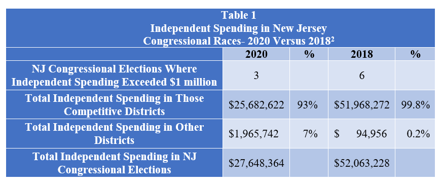 A comparison of 2020 and 2018 Congressional elections confirms that the trend toward less competitive districts in New Jersey- and a decline in independent spending- already seems to have begun.