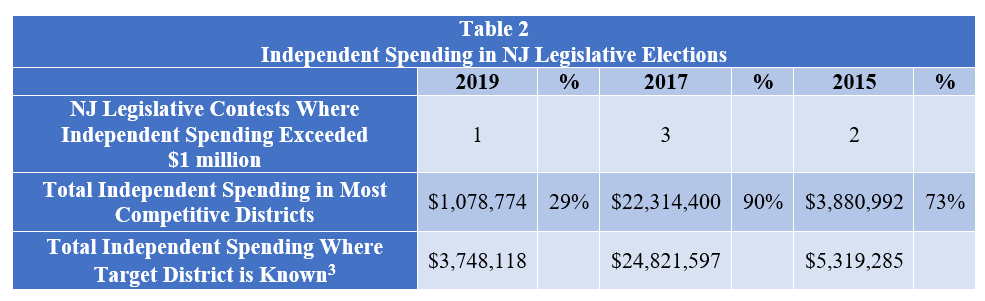 The history of campaign financing has shown that patterns of spending and thereby changes to the electoral landscape often derived from changes to campaign finance law. However, this potential slowing of independent group activity may defy this historical tendency and derive instead from developments other than statutory reforms; in this case the disincentive for these groups to spend heavily in New Jersey due to the configuration of congressional and legislative districts that have become less competitive.