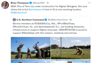 Joint Base McGuire-Dix-Lakehurst. Brian Thompson of NBC News tweeted pictures of the tent city presumably under construction as a receiving location for incoming refugees fleeing the Taliban-controlled Middle Eastern country.