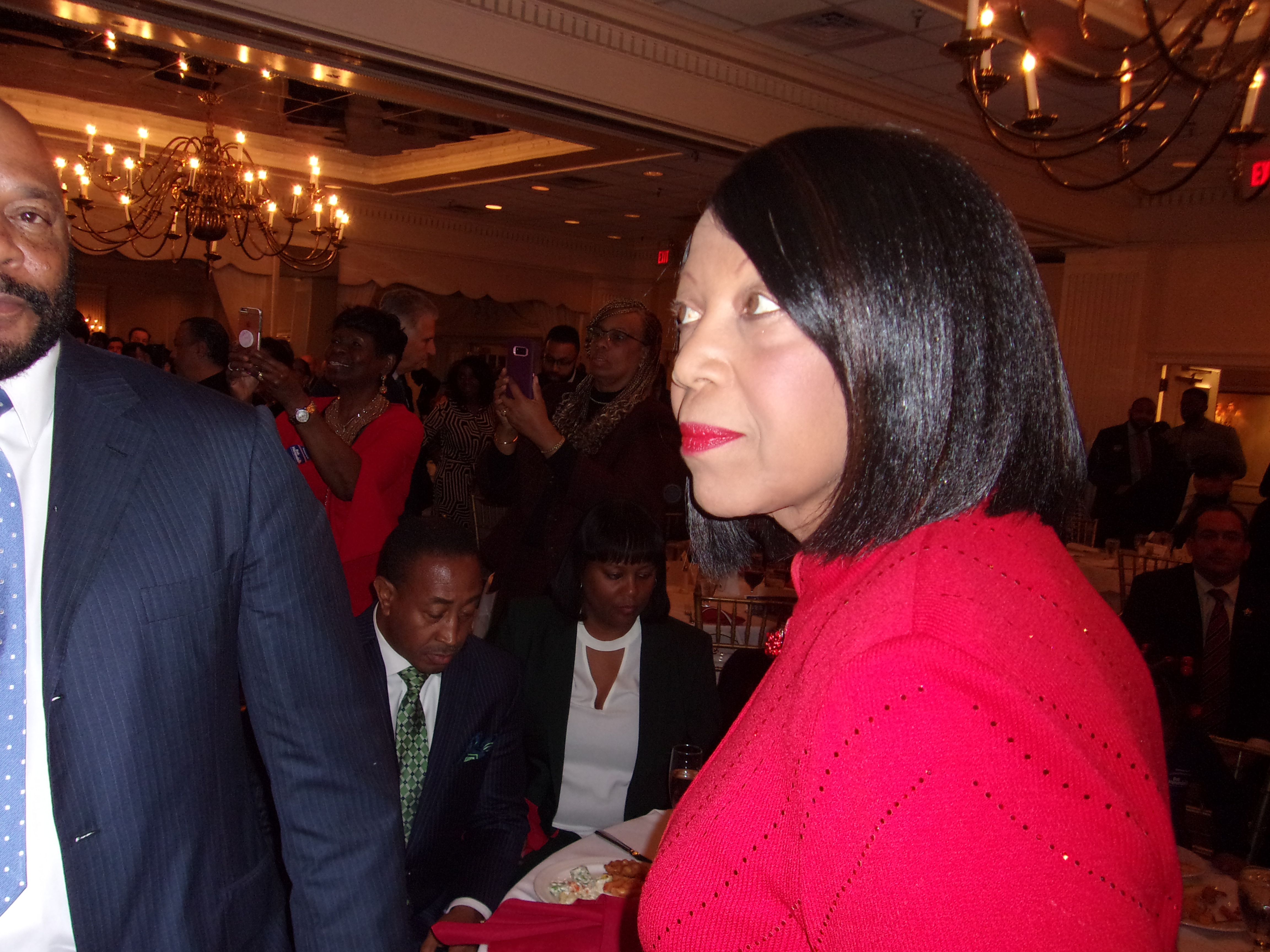 Senator Sandy Cunningham (D-31) revels as DeGise finds fellow county executive Jim Tedesco of Bergen in the crowd.