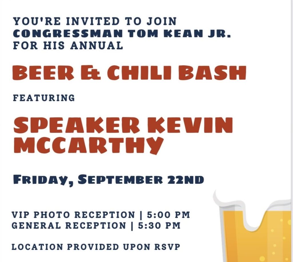 You would think that Tom Kean, Jr. would do everything possible to distance himself from Kevin McCarthy, who is as popular in New Jersey as Covid 19. Instead, au contraire! Kean, Jr. has invited the House Speaker to host a beer and chili fundraiser for him in New Jersey on September 22 at a place only disclosed to prospective attendees. Heaven forbid that there should be press coverage.