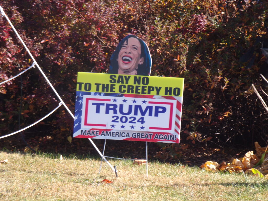 On a lawn in Bangor, Pennsylvania, I looked up and saw Harris' distorted picture accompanying a sign that said, "Say No to the Creepy Ho. Trump 2024. Make America Great Again." There was a little girl playing in the yard near where someone planted that sign.