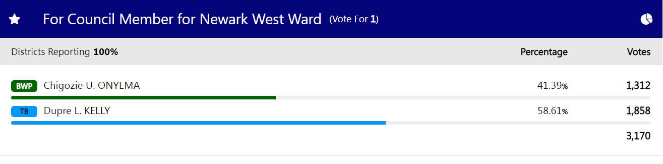 Dupre "DoItAll" Kelly has defeated Chigozie Onyema in Newark's West Ward.